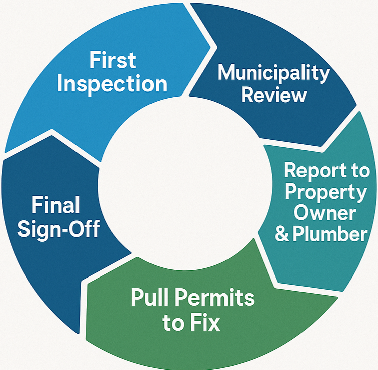 City reviews inspection → property owner receives inspection → select plumber → permits → repairs → sign-offs